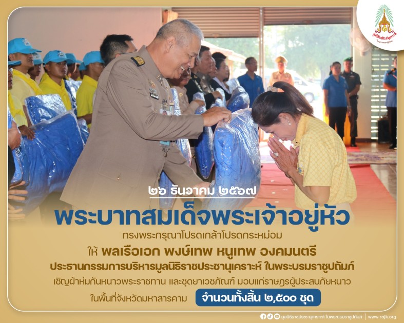 พระบาทสมเด็จพระเจ้าอยู่หัว ทรงพระกรุณาโปรดเกล้าโปรดกระหม่อมให้ พลเรือเอก พงษ์เทพ หนูเทพ องคมนตรี ประธานกรรมการบริหารมูลนิธิราชประชานุเคราะห์ ในพระบรมราชูปถัมภ์ เชิญผ้าห่มกันหนาวพระราชทาน และชุดยาเวชภัณฑ์ มอบแก่ นายวิบูรณ์ แววบัณฑิต ผู้ว่าราชการจังหวัดมหาสารคาม พร้อมทั้งราษฎรผู้ประสบภัยหนาวในพื้นที่จังหวัดมหาสารคาม จำนวน ๒,๔๙๗ ชุด ณ หอประชุมที่ว่าการอำเภอวาปีปทุม จังหวัดมหาสารคาม