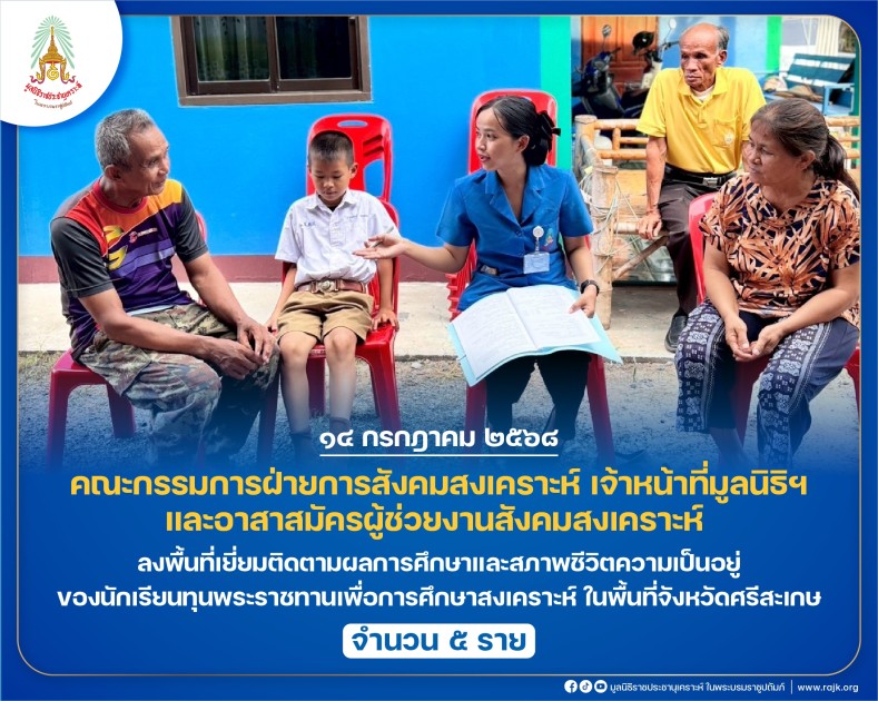คณะกรรมการฝ่ายการสังคมสงเคราะห์ เจ้าหน้าที่มูลนิธิฯ และอาสาสมัครผู้ช่วยงานสังคมสงเคราะห์ ลงพื้นที่เยี่ยมติดตามผลการศึกษาและสภาพชีวิตความเป็นอยู่ของนักเรียนทุนพระราชทานเพื่อการศึกษาสงเคราะห์ ในพื้นที่จังหวัดศรีสะเกษ