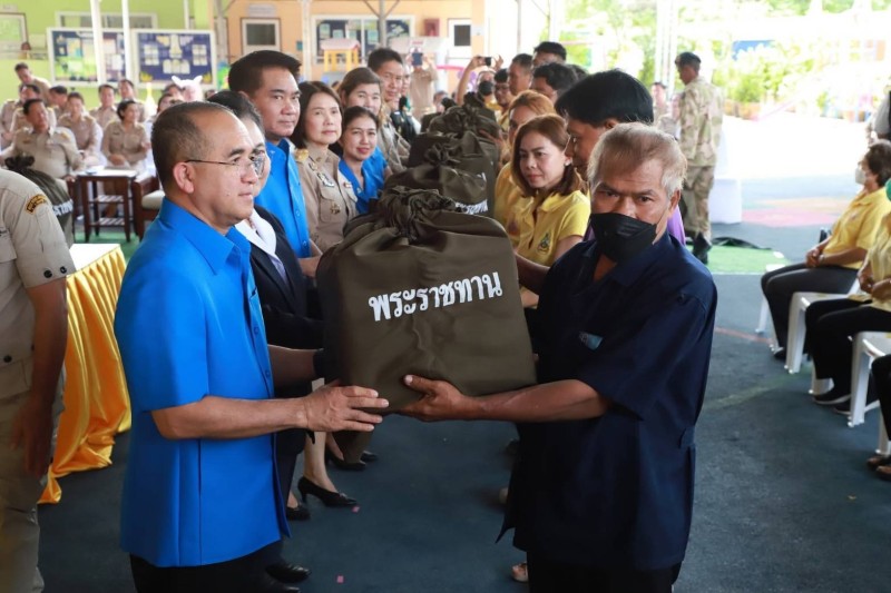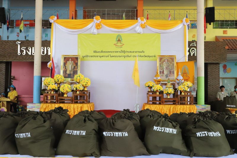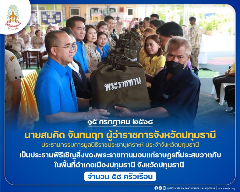 นายสมคิด จันทมฤก ผู้ว่าราชการจังหวัดปทุมธานี ประธานกรรมการมูลนิธิราชประชานุเคราะห์ ประจำจังหวัดปทุมธานี เป็นประธานพิธีเชิญสิ่งของพระราชทานมอบแก่ราษฎรที่ประสบวาตภัย ในพื้นที่อำเภอเมืองปทุมธานี จังหวัดปทุมธานี จำนวน ๕๘ ครัวเรือน
