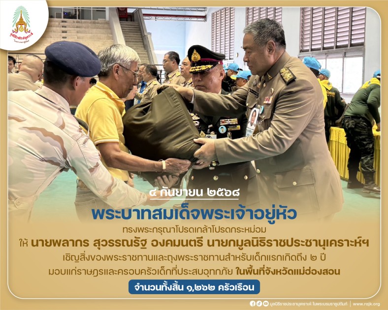 พระบาทสมเด็จพระเจ้าอยู่หัว ทรงพระกรุณาโปรดเกล้าโปรดกระหม่อมให้ นายพลากร สุวรรณรัฐ องคมนตรี นายกมูลนิธิราชประชานุเคราะห์ ในพระบรมราชูปถัมภ์ เชิญสิ่งของพระราชทานและถุงพระราชทานสำหรับเด็กแรกเกิดถึง ๒ ปี มอบแก่ราษฎรและครอบครัวเด็กที่ประสบอุทกภัย ในพื้นที่จังหวัดแม่ฮ่องสอน