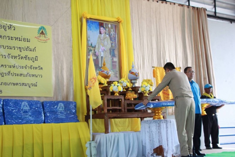 นายอนันต์ นาคนิยม ผู้ว่าราชการจังหวัดชัยภูมิ ประธานกรรมการมูลนิธิราชประชานุเคราะห์ ประจำจังหวัดชัยภูมิ เป็นประธานในพิธีเชิญผ้าห่มกันหนาวพระราชทานพร้อมชุดยาเวชภัณฑ์ มอบแก่ราษฎรผู้ประสบภัยหนาว ในพื้นที่ ๖ อำเภอของจังหวัดชัยภูมิ จำนวน ๓,๐๐๐ ชุด