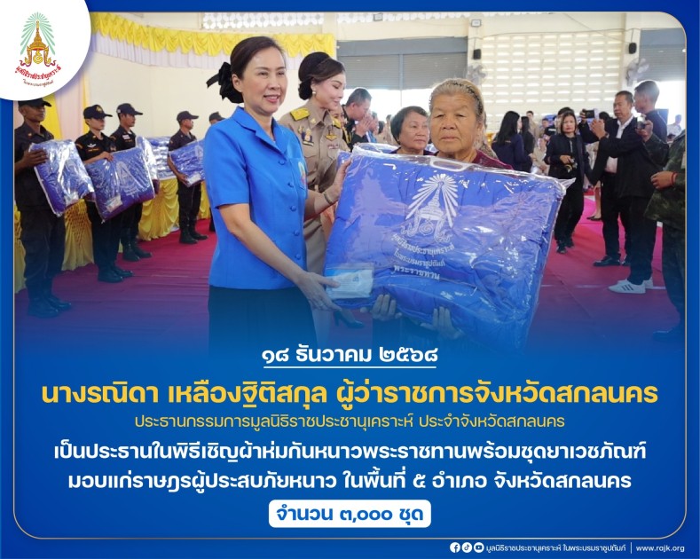 นางรณิดา เหลืองฐิติสกุล ผู้ว่าราชการจังหวัดสกลนคร ประธานกรรมการมูลนิธิราชประชานุเคราะห์ ประจำจังหวัดสกลนคร เป็นประธานในพิธีเชิญผ้าห่มกันหนาวพระราชทานพร้อมชุดยาเวชภัณฑ์ มอบแก่ราษฎรผู้ประสบภัยหนาว ในพื้นที่ ๕ อำเภอ จังหวัดสกลนคร จำนวน ๓,๐๐๐ ชุด