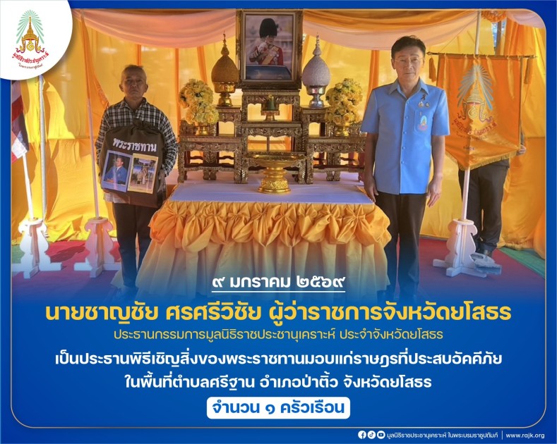 นายชาญชัย ศรศรีวิชัย ผู้ว่าราชการจังหวัดยโสธร ประธานกรรมการมูลนิธิราชประชานุเคราะห์ ประจำจังหวัดยโสธร เป็นประธานพิธีเชิญสิ่งของพระราชทานมอบแก่ราษฎรที่ประสบอัคคีภัย ในพื้นที่ตำบลศรีฐาน อำเภอป่าติ้ว จังหวัดยโสธร จำนวน ๑ ครัวเรือน
