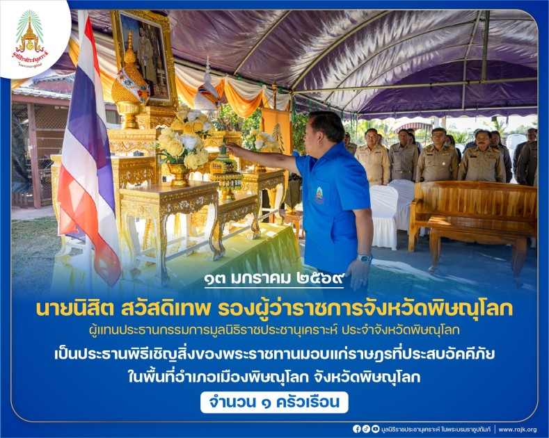 นายนิสิต สวัสดิเทพ รองผู้ว่าราชการจังหวัดพิษณุโลก ผู้แทนประธานกรรมการมูลนิธิราชประชานุเคราะห์ ประจำจังหวัดพิษณุโลก เป็นประธานพิธีเชิญสิ่งของพระราชทานมอบแก่ราษฎรที่ประสบอัคคีภัย ในพื้นที่อำเภอเมืองพิษณุโลก จังหวัดพิษณุโลก จำนวน ๑ ครัวเรือน