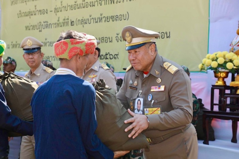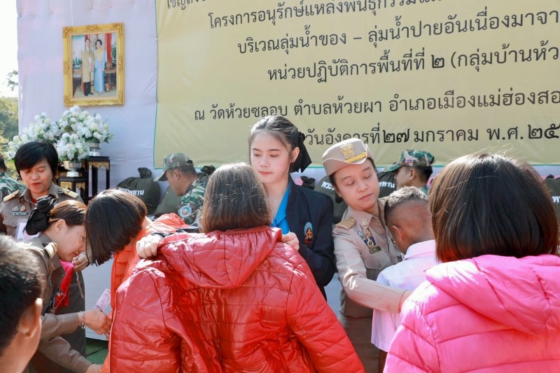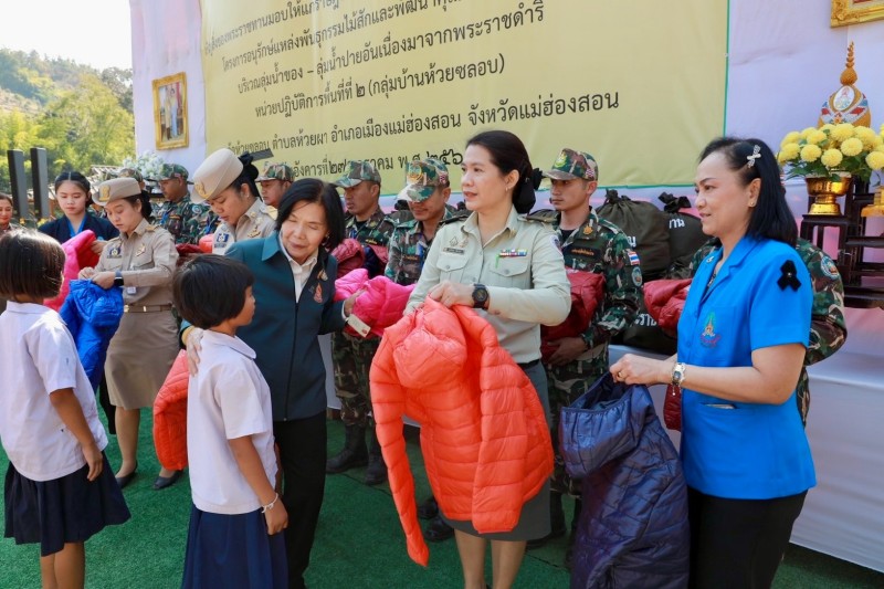 จากนั้น องคมนตรีและเดินทางไปยังวัดห้วยซลอบ ตำบลห้วยผา อำเภอเมืองแม่ฮ่องสอน จังหวัดแม่ฮ่องสอน เพื่อเชิญสิ่งของพระราชทานไปมอบแก่ราษฎรและผู้ปฏิบัติงานในพื้นที่โครงการฯ ประกอบด้วย เสื้อกันหนาวเด็ก จำนวน ๑๒๓ ตัว และถุงพระราชทาน จำนวน ๑๑๔ ถุง
