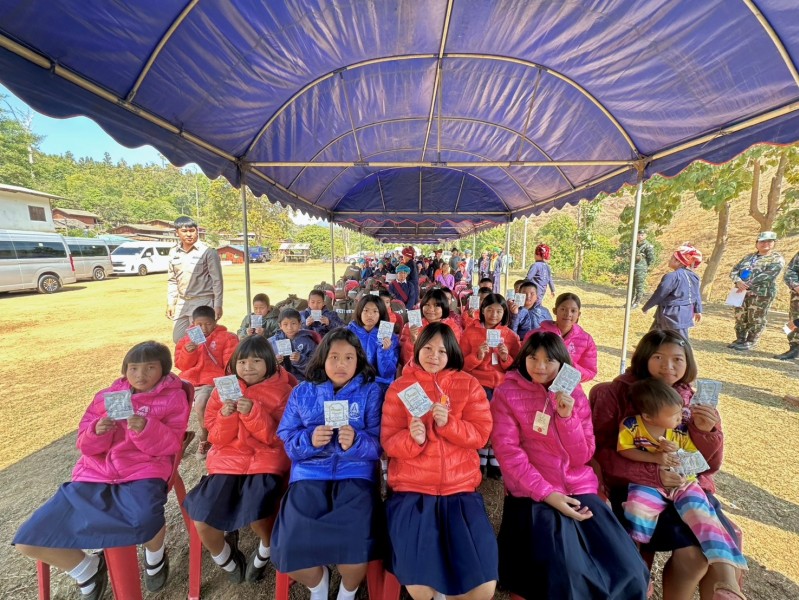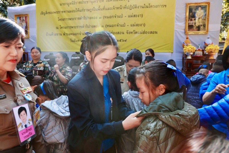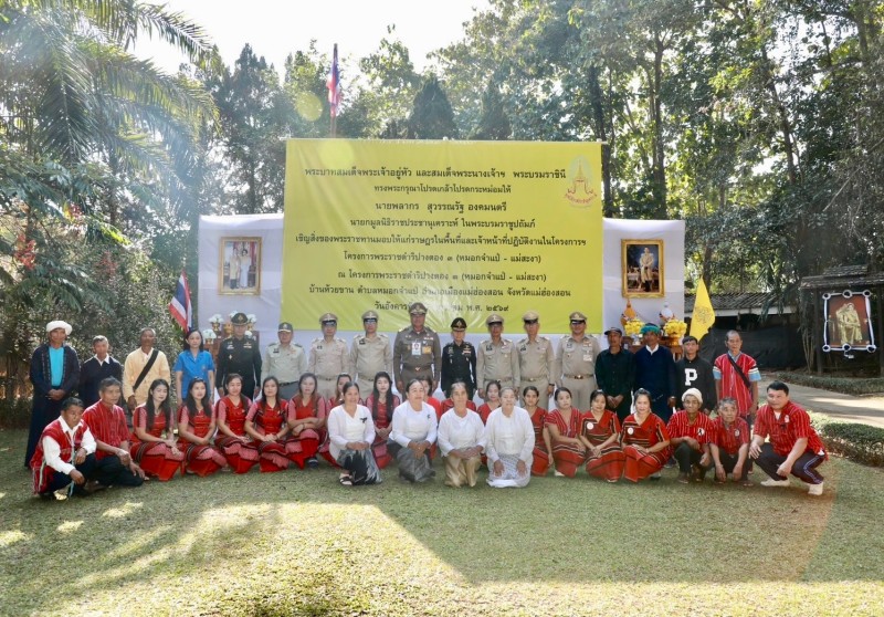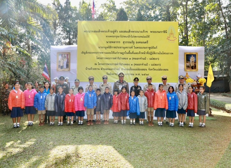 นายพลากร สุวรรณรัฐ องคมนตรี นายกมูลนิธิราชประชานุเคราะห์ ในพระบรมราชูปถัมภ์ ประธานอนุกรรมการติดตามและขับเคลื่อนโครงการอันเนื่องมาจากพระราชดำริในพื้นที่ภาคเหนือ พร้อมด้วยนายศุภรัชต์ อินทราวุธ รองเลขาธิการ กปร. เจ้าหน้าที่มูลนิธิราชประชานุเคราะห์ ในพระบรมราชูปถัมภ์ ที่ปรึกษาคณะอนุกรรมการฯ และคณะอนุกรรมการฯ เดินทางไปยังโครงการพระราชดำริปางตอง ๓ (หมอกจำแป่ - แม่สะงา) บ้านห้วยขาน ตำบลหมอกจำแป่ อำเภอเมืองแม่ฮ่องสอน จังหวัดแม่ฮ่องสอน เพื่อเชิญสิ่งของพระราชทานจากพระบาทสมเด็จพระเจ้าอยู่หัว และสมเด็จพระนางเจ้า ฯ พระบรมราชินี ไปมอบแก่ราษฎรและผู้ปฏิบัติงานในพื้นที่โครงการ ได้แก่ เสื้อกันหนาวสำหรับเด็ก จำนวน ๑๐๒ ตัว และถุงพระราชทาน จำนวน ๑๒๘ ถุง
