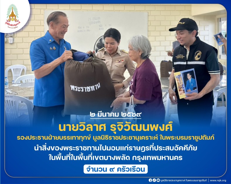 นายวิลาศ รุจิวัฒนพงศ์ รองประธานฝ่ายบรรเทาทุกข์ มูลนิธิราชประชานุเคราะห์ ในพระบรมราชูปถัมภ์ นำสิ่งของพระราชทานไปมอบแก่ราษฎรที่ประสบอัคคีภัย ในพื้นที่เขตบางพลัด กรุงเทพมหานคร จำนวน ๙ ครัวเรือน เพื่อสร้างขวัญกำลังใจในการดำรงชีวิตแก่ผู้ประสบภัยต่อไป ณ ศูนย์พักพิง อาคารเวชยันตรังสฤษฎ์ วัดบวรมงคลวรวิหาร