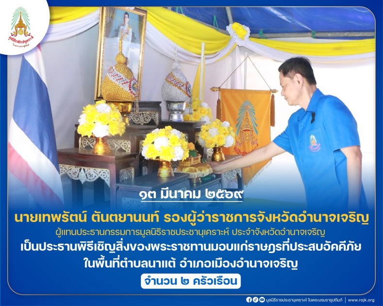 นายเทพรัตน์ ตันตยานนท์ รองผู้ว่าราชการจังหวัดอำนาจเจริญ เป็นประธานพิธีเชิญสิ่งของพระราชทานมอบแก่ราษฎรที่ประสบอัคคีภัย ในพื้นที่ตำบลนาแต้ อำเภอเมืองอำนาจเจริญ จำนวน ๒ ครัวเรือน