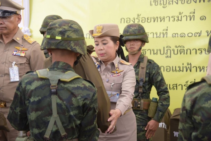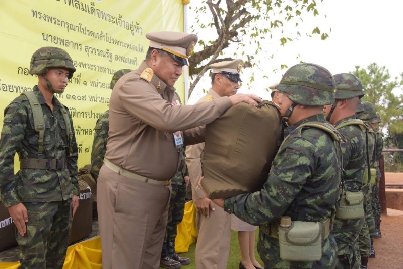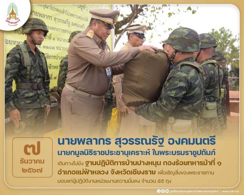 ช่วงบ่าย คณะเดินทางไปยังฐานปฏิบัติการบ้านปางหนุน กองร้อยทหารม้าที่ ๑ อำเภอแม่ฟ้าหลวง จังหวัดเชียงราย เชิญถุงพระราชทานไปมอบแก่ผู้ปฏิบัติงานหน่วยงานความมั่นคง จำนวน ๖ หน่วยงาน จำนวน ๕๕ ถุง