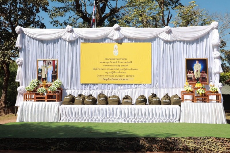 นายพลากร สุวรรณรัฐ องคมนตรี นายกมูลนิธิราชประชานุเคราะห์ฯ ประธานอนุกรรมการติดตามและขับเคลื่อนโครงการอันเนื่องมาจากพระราชดำริในพื้นที่ภาคเหนือ พร้อมด้วย นายศุภรัชต์ อินทราวุธ รองเลขาธิการ กปร. เจ้าหน้าที่มูลนิธิราชประชานุเคราะห์ ในพระบรมราชูปถัมภ์ และคณะอนุกรรมการฯ เดินทางไปยังฐานปฏิบัติการบ้านบ่อแร่ หมวดปืนเล็กที่ ๒ กองร้อยทหารราบที่ ๑๔๒๒ ตำบลแม่จัน อำเภออุ้มผาง จังหวัดตาก เพื่อเชิญถุงพระราชทานจากพระบาทสมเด็จพระเจ้าอยู่หัว และสมเด็จพระนางเจ้า ฯ พระบรมราชินี ไปมอบแก่ผู้ปฏิบัติงานหน่วยความมั่นคง จำนวน ๑๙ ชุด