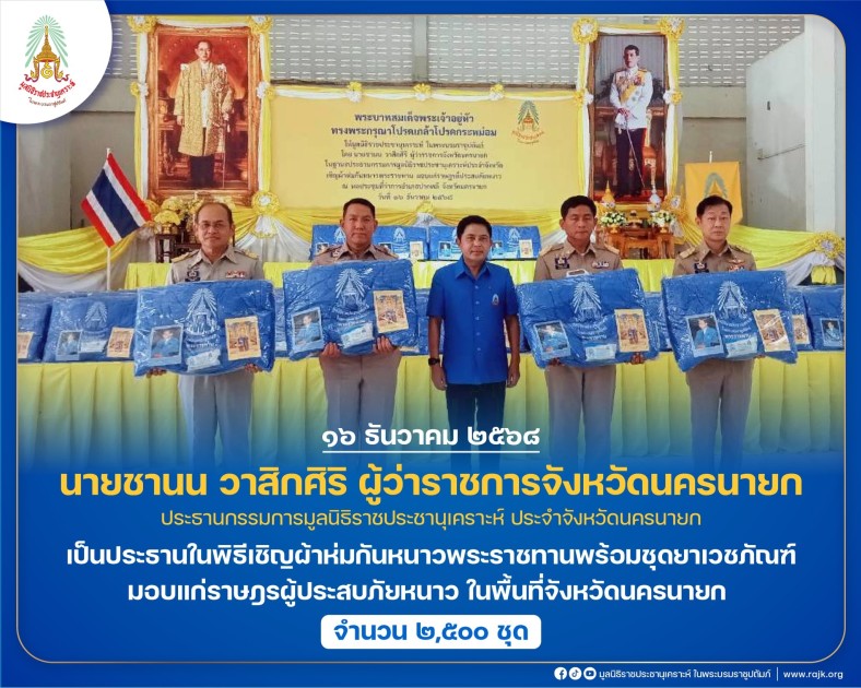 นายชานน วาสิกศิริ ผู้ว่าราชการจังหวัดนครนายก ประธานกรรมการมูลนิธิราชประชานุเคราะห์ ประจำจังหวัดนครนายก เป็นประธานในพิธีเชิญผ้าห่มกันหนาวพระราชทานพร้อมชุดยาเวชภัณฑ์ มอบแก่ราษฎรผู้ประสบภัยหนาว ในพื้นที่จังหวัดนครนายก จำนวน ๒,๕๐๐ ชุด ณ หอประชุมที่ทำการอำเภอปากพลี จังหวัดนครนายก