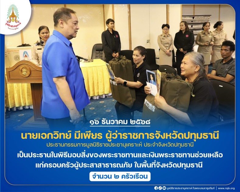นายเอกวิทย์ มีเพียร ผู้ว่าราชการจังหวัดปทุมธานี ประธานกรรมการมูลนิธิราชประชานุเคราะห์ ประจำจังหวัดปทุมธานี เป็นประธานในพิธีมอบสิ่งของพระราชทานและเงินพระราชทานช่วยเหลือแก่ครอบครัวผู้ประสาสาธารณภัย ในพื้นที่จังหวัดปทุมธานี จำนวน ๒ ครัวเรือน ณ ห้องประชุมบางหลวง ๑ ชั้น ๓ เทศบาลตำบลบางหลวง หมู่ที่ ๓ ตำบลบ้านฉาง อำเภอเมืองปทุมธานี จังหวัดปทุมธานี