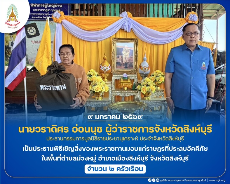 นายวราดิศร อ่อนนุช ผู้ว่าราชการจังหวัดสิงห์บุรี ประธานกรรมการมูลนิธิราชประชานุเคราะห์ ประจำจังหวัดสิงห์บุรี เป็นประธานพิธีเชิญสิ่งของพระราชทานมอบแก่ราษฎรที่ประสบอัคคีภัย ในพื้นที่ตำบลม่วงหมู่ อำเภอเมืองสิงห์บุรี จังหวัดสิงห์บุรี จำนวน ๒ ครัวเรือน