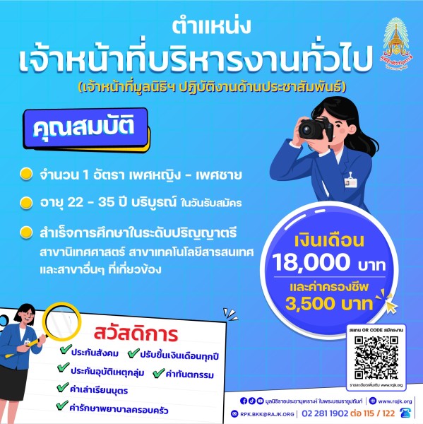 ตำแหน่ง เจ้าหน้าที่บริหารงานทั่วไป (ปฏิบัติงานด้านประชาสัมพันธ์) จำนวน 1 อัตรา