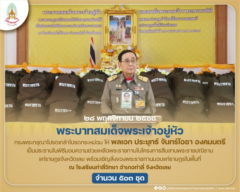 พระบาทสมเด็จพระเจ้าอยู่หัว ทรงพระกรุณาโปรดเกล้าโปรดกระหม่อมให้ พลเอก ประยุทธ์ จันทร์โอชา องคมนตรี เป็นประธานในพิธีมอบความช่วยเหลือพระราชทานในโครงการสืบสานพระราชปณิธาน แก่ราษฎรจังหวัดเลย เพื่อสืบสาน รักษา และต่อยอดพระราชปณิธานและพระบรมราโชบายของพระบาทสมเด็จพระบรมชนกาธิเบศรมหาภูมิพลอดุลยเดชมหาราช บรมนาถบพิตร ในการให้ความช่วยเหลือแก่ราษฎรในพื้นที่ห่างไกลทุรกันดาร พร้อมกับรับทราบปัญหาความเดือดร้อน เพื่อนำไปสู่การแก้ไขและพัฒนาให้ราษฎรมีชีวิตและความเป็นอยู่ที่ดีขึ้น รวมทั้งเชิญพระราชกระแสความห่วงใยของพระบาทสมเด็จพระเจ้าอยู่หัว และของสมเด็จพระนางเจ้าฯ พระบรมราชินี ไปกล่าวให้ราษฎรได้รับทราบ และเชิญสิ่งของพระราชทานไปมอบให้กับราษฎรในพื้นที่